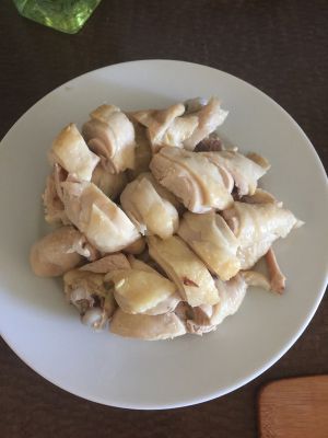 将洗好的三黄鸡放入锅中烧开下入鸡。煮制8分钟,关火闷10分钟。捞出
