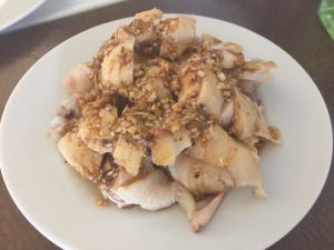 鸡腿斩块摆盘。调一个恰到好处的料汁就是第六个基本点。3份醋,2份生抽,半份糖,根据口味放盐,成料汁。撒上花生碎,小葱,熟芝麻,淋上料汁和红油即可。