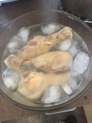 准备一大碗冰水,把焖好的鸡腿放到冰水中冰镇。
