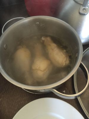 煮锅加水,水量稍微多一点,加一小勺盐,5g左右,入底味。2-3个鸡腿放在小锅里中高火煮10-15。关火,盖好盖子,焖15分钟。就是到全熟的状态(筷子扎进肉里可以很轻松的拔出)。