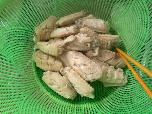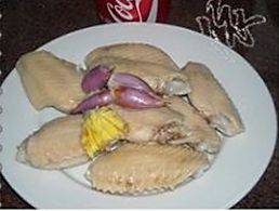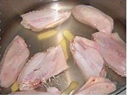 鸡翅洗净、放葱姜水中煮沸捞出、沥干水份