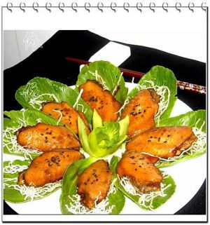 把鸡翅放进菜叶的粉丝上面,撒上黑芝麻;