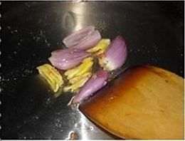 热油锅,放进拍扁的生姜和干葱头煸炒出香味;