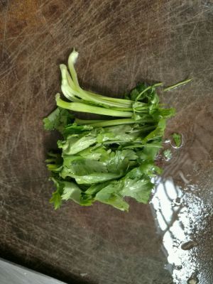 香菜洗干净切段,加入鸡翅中煸炒