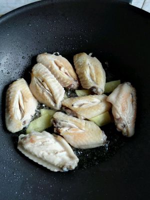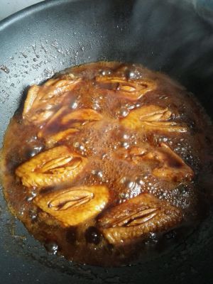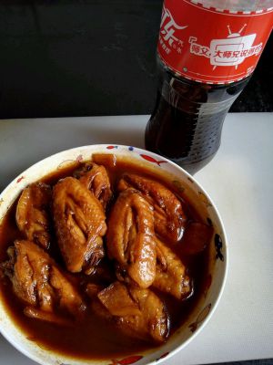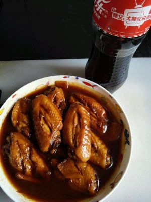 2. 锅中放入少量油,,将鸡翅煸炒至金黄色,倒入酱油在煸炒几下,然后倒入可乐,可乐没过鸡翅为好,大火咕嘟咕嘟。