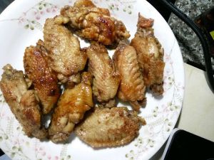 鸡翅上划道,加两汤匙酱油腌制入味,25分钟后洗净,放入姜蒜,微波炉高火5分钟