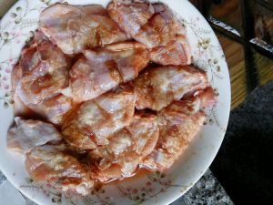 撒上盐和生姜粉,片刻后倒入适量料酒腌制,一小时即可