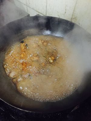 留有底油。加入白糖慢慢融化,,再倒入可乐,生抽,老抽,米醋,大料,葱段,姜片大火烧开后转小火收汁加些鸡精,料酒