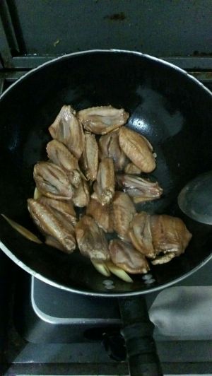 锅中放入少许油 待热放入葱姜蒜煸至出香味 放入翅根用小火将两面煎至金黄