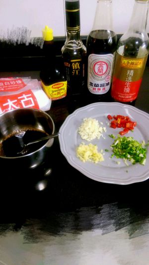 姜蒜切蓉,指天椒,葱,切粒。生抽,老抽,美极鲜酱油,醋,白糖,清水,调成调料汁,是甜甜酸酸的口味