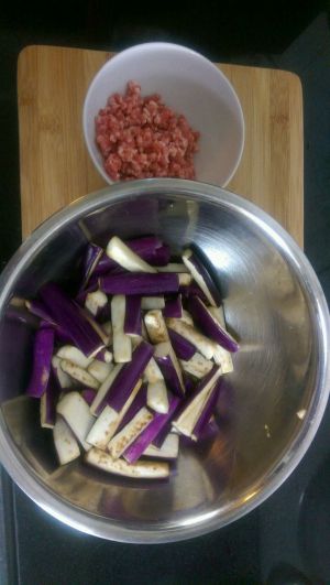 茄子切长条,用少许盐捞均匀,搁置一会儿,等茄子出水,猪肉糜用点料酒,胡椒粉拌匀