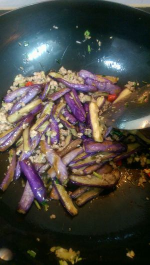 倒入茄子翻炒一下,倒入调味汁,调味汁不一定全部倒入,视情况而定,如果味道已经够了,就不要全部倒入