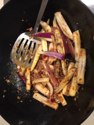 用底油爆炒葱姜蒜,香味出来后,放红辣椒,然后放茄子,翻炒。均匀后放鱼香汁。继续翻炒,此时香味已浓。