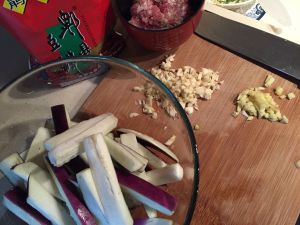 紫茄洗净切小指粗细约5厘米长条,用少许盐腌一下,姜蒜切末备用。