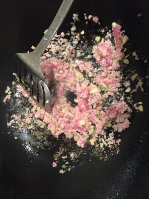 锅内余少许油,放入肉泥和蒜蓉炒香,加入红椒段儿