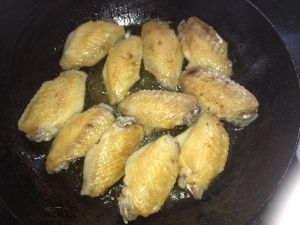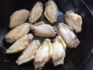 放入葱节、姜片、料酒、鸡翅,一起抄水,三分钟左右,捞起,沥干。