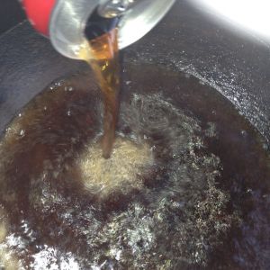 倒入200ml左右的可乐,一小勺酱油。注意要时不时的翻炒一下