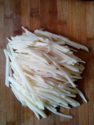 把土豆削皮切丝,然后泡水三分钟,这样土豆的淀粉都泡掉口感好!