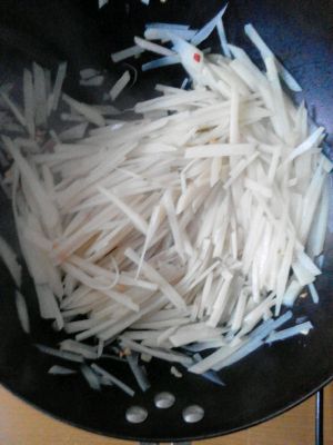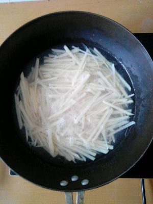 油烧热放入沥干水的土豆丝开炒!炒的时候如果有沾锅现象可以放一点点水。