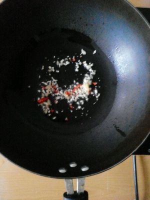 起锅,热油,把切好的蒜、姜、辣椒沫放入锅中炒香