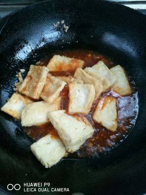 煎至两面金黄后,倒入调好的酱汁,煮至豆腐入味