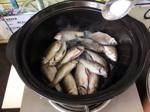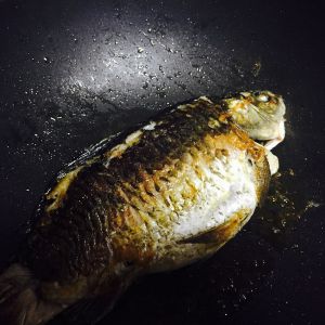 锅内加入少量油,热锅后放入鱼,不要不停翻鱼,小火单面煎15至20分钟后翻另一面,直至两面呈金黄色,可适时多煎久一下,汤会更浓。