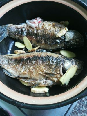 接着就把煎好的鱼小心放入砂锅中,再放入些姜片(怕腥的,可以放多几片)