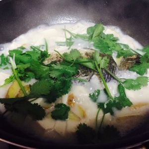 熬大致25分钟,汤为浓白色,加入适量鸡精和香菜,2分钟即可出锅咯