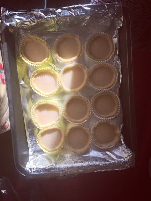 烤箱上下调到120-130左右预热、先烤蛋挞皮3分钟(我之前就用上下140左右烤10分钟,再用上下开180度再烤10-15分钟);
