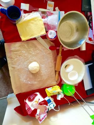 1: 和面:250G面粉加100g水。80G化好的黄油。揉面团。 静置三十分钟。 2.准备黄油120克。 放入保鲜袋。擀平成黄油平饼。 如左上角黄油。放入冰箱静置十分钟定型。(轻轻地擀。可以轻轻的敲开。一定轻轻的) 3.把面团擀成长方形。 面积是黄油饼的两倍之多。4.把黄油放在擀好的面皮的二分之一处。 用面皮包裹黄油饼后继续擀。 两边对折。继续擀。 反复三四次即可。 (一定要轻轻的擀,要不停的撒面粉,不然黄油会漏)