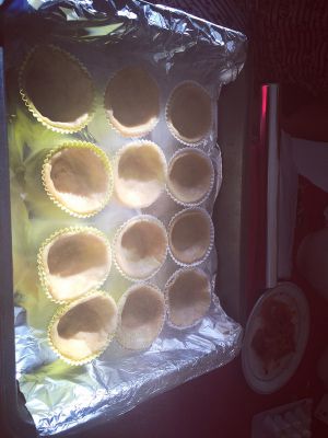 擀好的面皮卷起来放入冰箱静置两个小时。 后取出。 切丸子大小。 然后揉成小球放入纸杯。沿杯壁捏平。 厚度自己定。