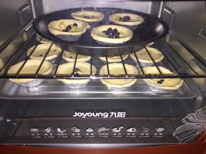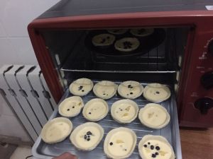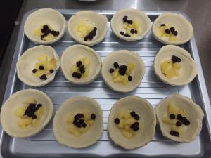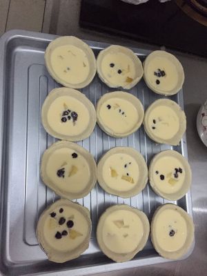 将10个挞皮解冻,把蓝莓干,菠萝干分别放进每个挞皮里