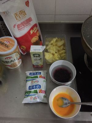 蛋液。 牛奶100。水100。 糖100。 三个鸡蛋。搅拌均匀后过滤 倒入蛋皮内即可。
