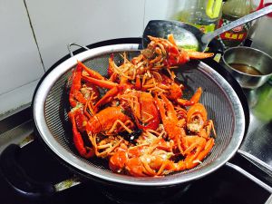 起锅大火烧油油烧的很热的时候下入小龙虾和香料,爆炒。