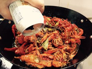 倒入小龙虾翻炒均匀后倒入啤酒,啤酒我买的是青岛500ml,刚好没过小龙虾,然后大火焖烧。