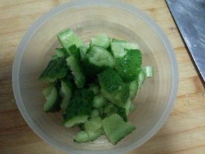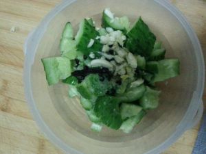 调汁:备碗把所有的配料倒入碗中搅拌,用勺子均匀的浇到黄瓜上,可以稍加搅拌。