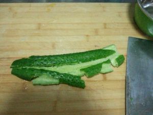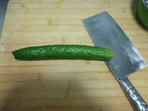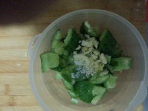 黄瓜清水洗净,用菜刀拍碎,装盘放少许的盐淹2分钟。