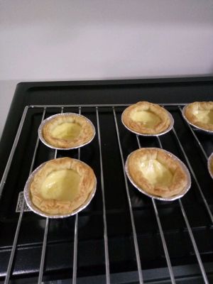 蛋挞皮放在烤架上,现成的鸡蛋液倒入蛋挞皮中