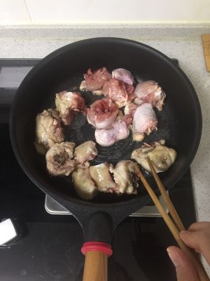 将洗好的鸡腿用吸油纸吸干表面的水分,防止入锅时油会溅出来,随后把处理好的鸡腿剁成小块,方便入味。生姜少许切丝备用,锅上灶倒入少量油加热,倒入准备好的鸡腿,将表面煎成金黄色。