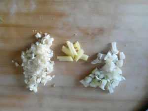 将生姜,大蒜剁成丁,待用。
