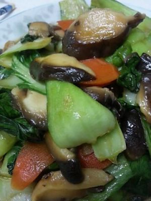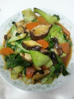炒至颜色变深,放入香菇和胡萝卜。5.加入耗油,酱油,盐,鸡精,水淀粉翻炒,均匀后出勺。