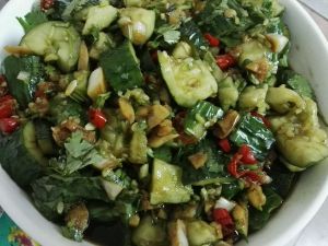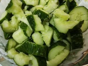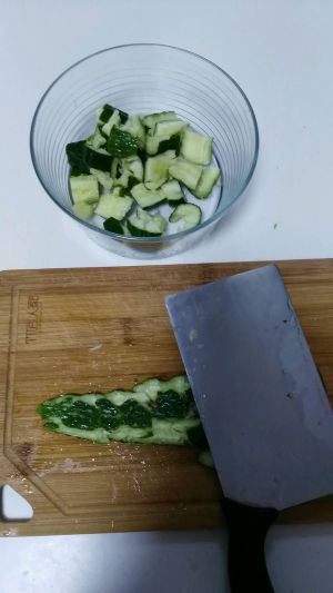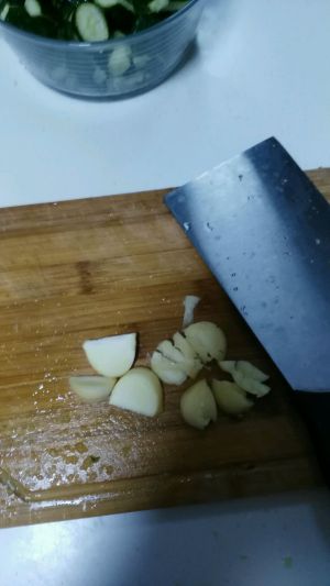 大蒜也用刀拍碎,倒入黄瓜里,尽量拍的碎一点,如果家里有小擀面杖在砸碎一点!就像吃饺子的蒜醋一样!