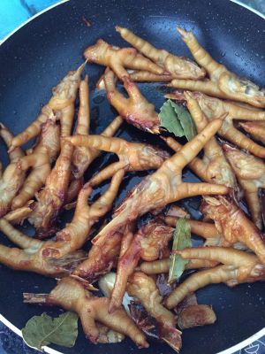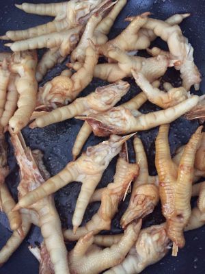 锅内放油糖,炒糖色,放入鸡爪翻炒上色,放入葱姜,生抽,老抽,料酒