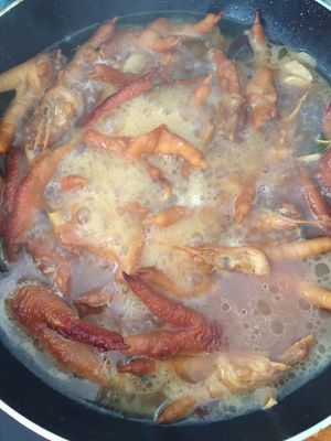 加开水,莫过鸡爪,中火炖15分钟,最后开大火收汁,加少许盐,鸡精,葱花 就可以出锅了