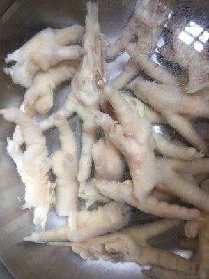 给鸡爪剪掉指甲,清水洗净,加水烧开