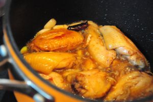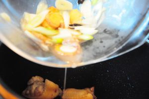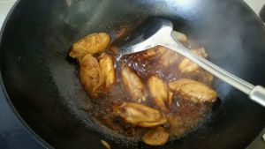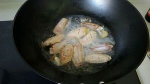 锅中放入少许油,一小勺白糖。炒糖变色起泡迅速放入翅中翻炒上色,填入配料炒出香 味,加入料酒、生抽。