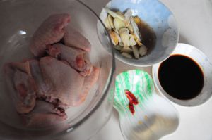 将翅中洗净控干水份,葱、姜、蒜切好备用。