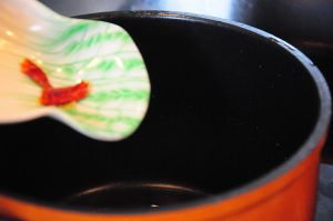 锅内放入底油,油热后,放入干辣椒,煸炒。