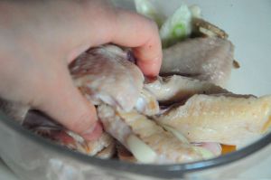 把小碗里的调料倒入鸡翅中。