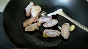 下入鸡翅翻炒一会,直至鸡翅表面金黄